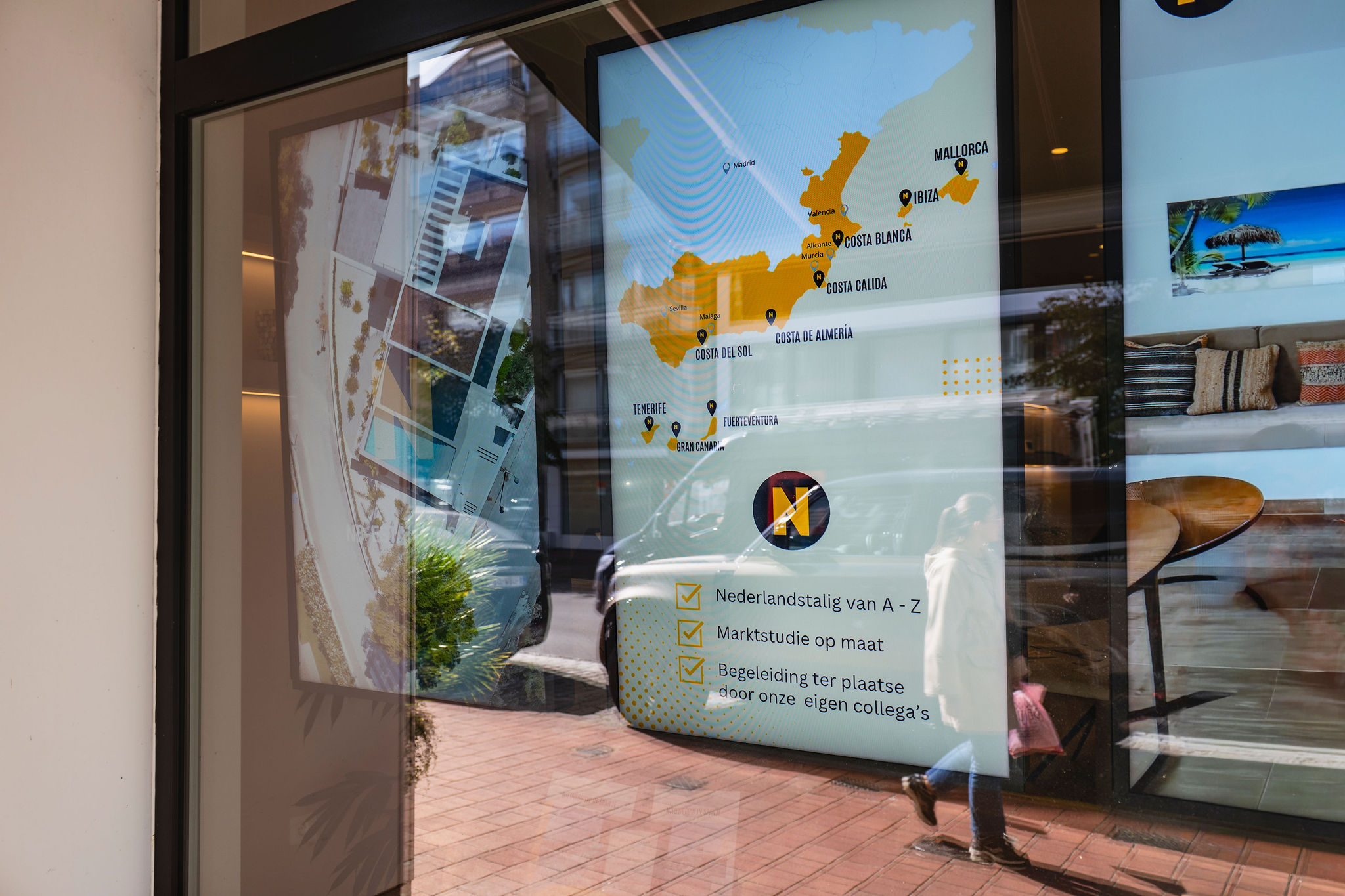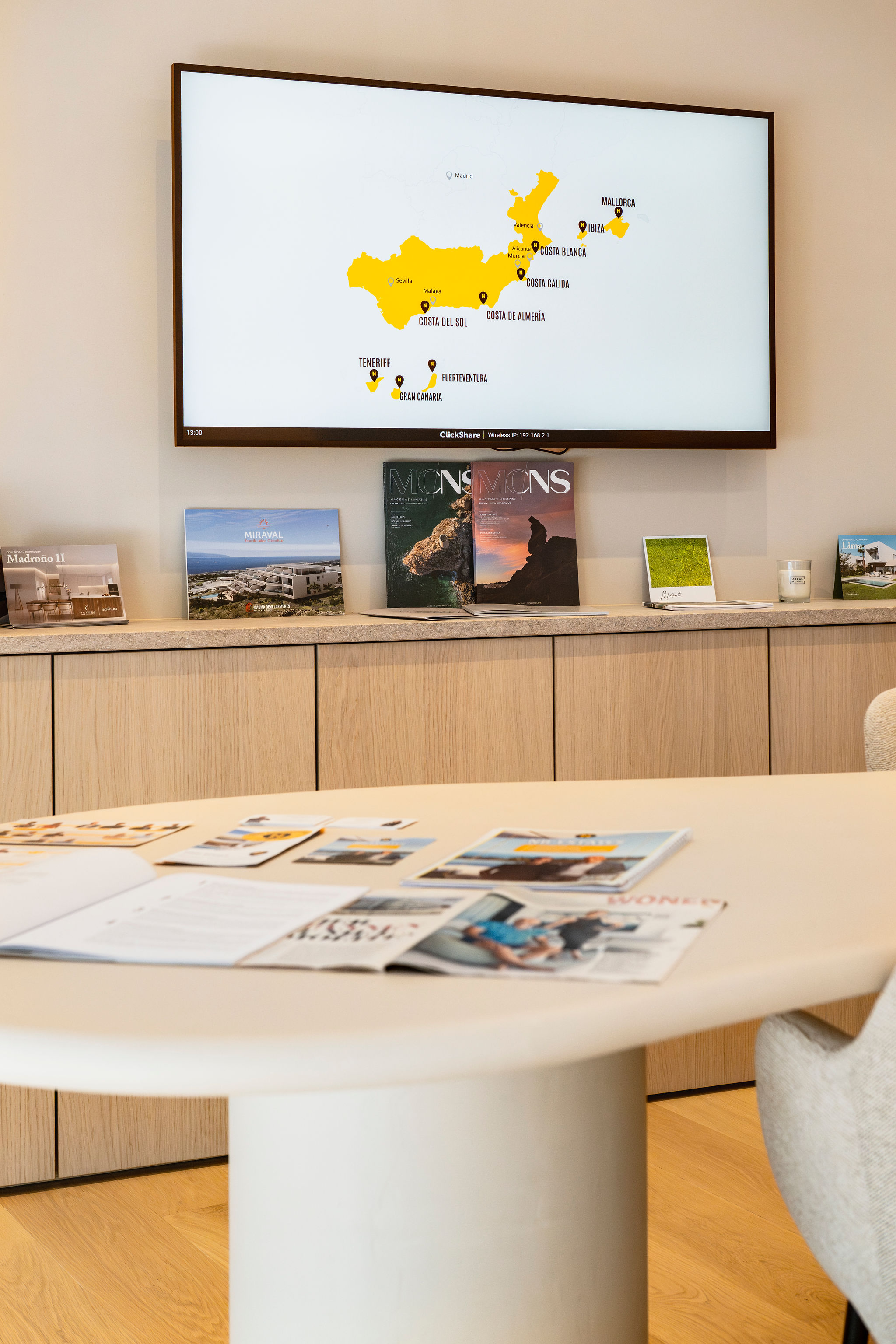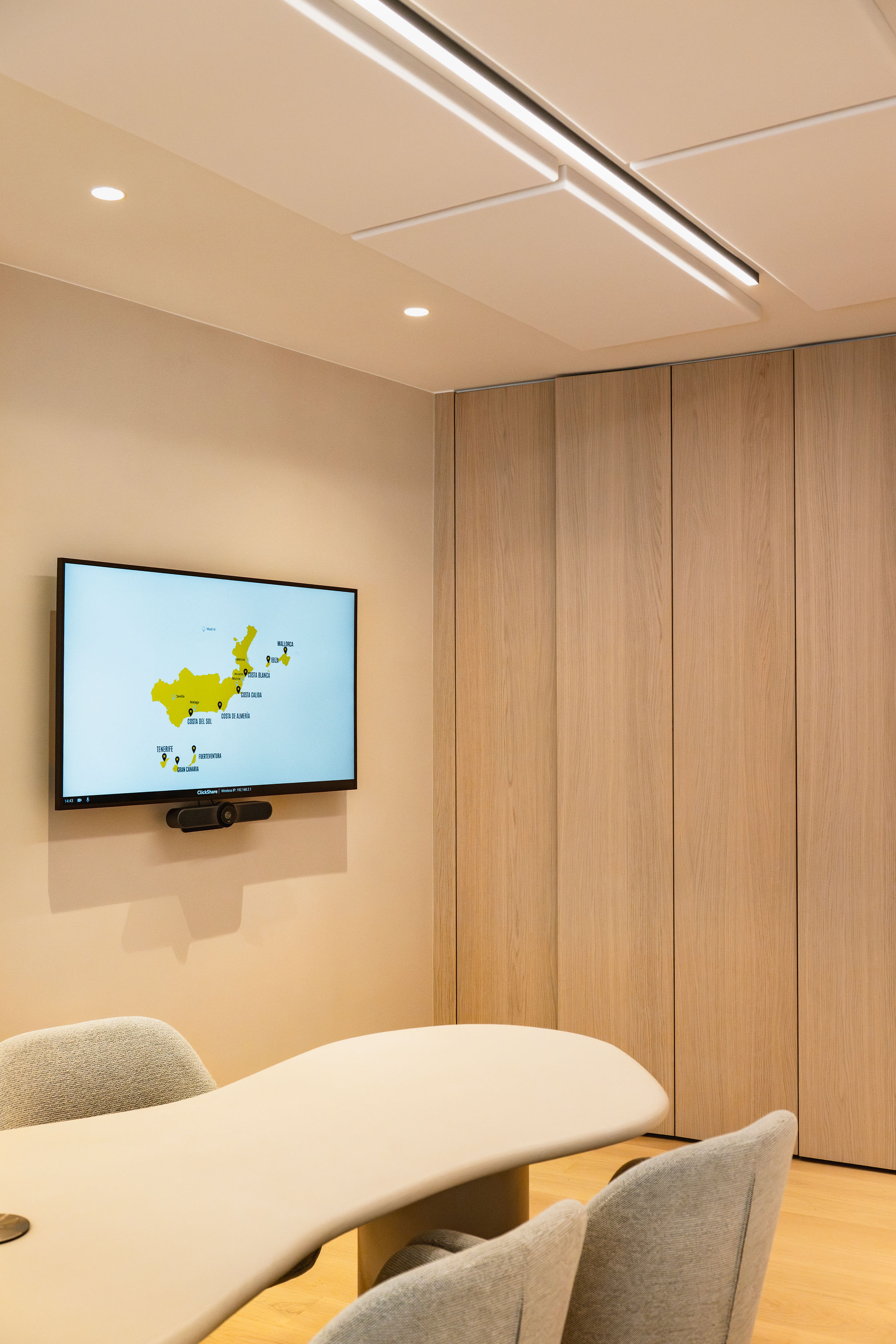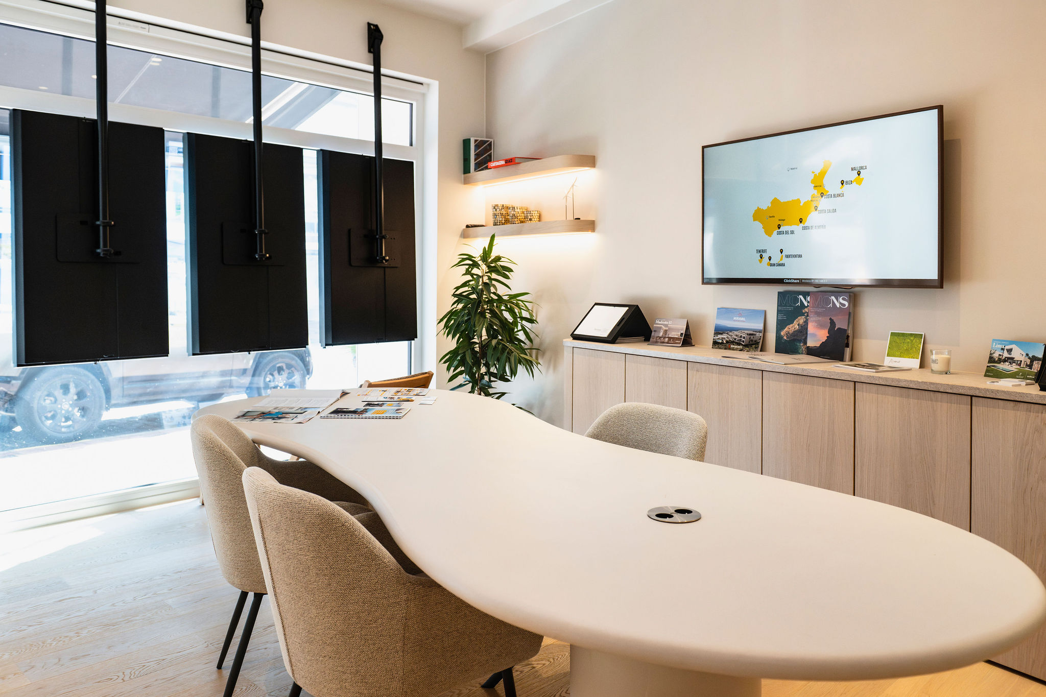 Nieuwbouw in Spanje, een vastgoedkantoor in hartje Knokke, deed een beroep op TechWorks voor de audiovisuele inrichting van hun kantoor en etalage. We installeerden twee beeldschermen in het kantoor, uitgerust met Barco ClickShare voor draadloos presenteren en gebruiksvriendelijke videoconferencing. In de etalage werden drie professionele schermen geïntegreerd voor heldere, dynamische communicatie met voorbijgangers. Om het comfort in de ruimte te verhogen, werkten we het plafond af met stijlvolle akoestische panelen die zorgen voor een aangename geluidsbeleving tijdens elk gesprek of videocall. Een helder voorbeeld van hoe technologie en uitstraling naadloos kunnen samengaan.